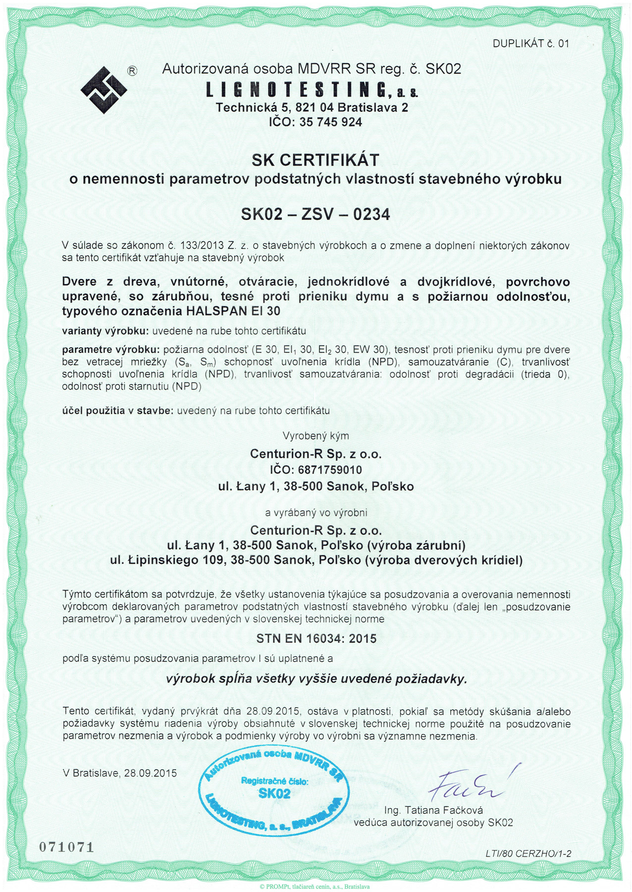 Certifikát - dvere 110